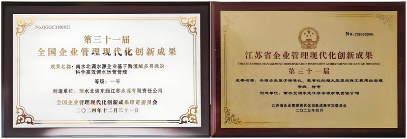 近日,全国、江苏省企业管理创新大会分别在珠海、南京召开,同步正式发布企业管理现代化创新成果,91视频 《南水北调水源企业基于跨流域多目标的科学高效调水运营管理》获第三十一届全国企业管理现代化创新成果一等奖,《水源企业基于标准化、数智化的超大型泵站群工程建设管理》获第三十一届江苏省企业管理现代化创新成果特等奖。公司党委书记、董事长袁连冲在江苏省企业管理创新大会上交流了公司围绕大型泵站群建设与管理,以标准化、数智化驱动企业高质量发展的做法和阶段成果。