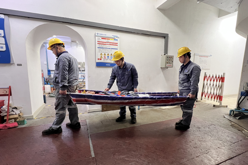 本次演练模拟检修人员在2米高平台作业时,因未规范系挂安全带失足坠落,出现昏迷、骨折及出血的紧急状况的场景。险情发生后,现场监护人员第一时间启动内部应急响应,总指挥迅速到位、精准调度,各救援小组分工明确、衔接无缝。抢险组率先开展事故架体排险加固,彻底阻断次生风险蔓延;救护组接力跟进,严格遵照高空坠落救护流程,有序为“伤员”实施颈椎保护、腿部止血包扎及骨折固定;转运组衔接上阵,使用担架将“伤员”平稳转运至安全区域,全程按既定流程闭环推进,充分展现了高效协同的作战能力。演练结束后,现场及时召开总结评估会,围绕班前会“安全交底”实效性、应急步骤衔接流畅度、小组分工合理性等关键环节,对演练全过程复盘梳理,深入剖析各阶段工作亮点与优化空间,为后续完善应急机制积累实战经验。